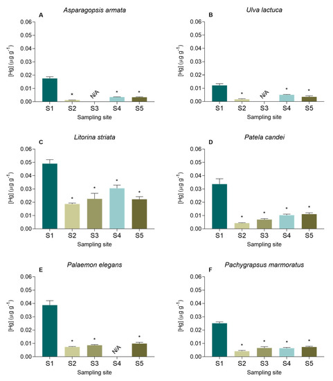 Mercury concentration (µg g−1) in different intertidal species. N/A means that species were not analyzed in these sampling sites. Asterisks (*) denote statistically significant (p < 0.05) differences when compared with the wreck site (S1).
