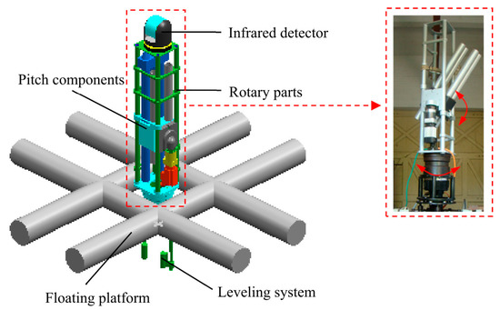 The structural design of the overall system is shown in Figure 1, which is mainly composed of a floating platform, a weapon system (including an infrared detector, rotating parts, pitching parts, and base components), and a self-leveling system. The floating platform is designed to carry the whole weapon system, enabling the system to float on the sea surface and resist wave-caused swaying motion. Then, the weapon system searches for and locks the target utilizing the infrared detector. In order to compensate for the wave-induced swaying angle on the weapon system, a real-time leveling system is attached at the bottom of the system. The total load carried by the floating platform is 262.82 kg including the search aiming system, and the displaced volume is m3.