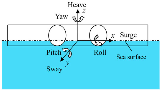 Uncontrollable inclination can cause unexpected damage, such as interference and collision between the floating body and other objects or other floating bodies, especially if the two floating bodies need to be in a relative static position relationship. Although there are many ways to deal with damage, collision reduction methods, materials, or devices have been proposed [12,13,14,15]. However, it is more important to consider the mechanism of floating body sloshing to restrain a floating body’s motion induced by sea waves. Since the 1940s, researchers have begun to focus on the hydrodynamic theory of ship sway, and Green’s function was applied to establish the hull disturbance velocity potential function to solve the ship motion problem, which is still an important model for the swaying problem to this day [16]. After the 1950s, the slicing theory proposed by Corvin-kraukowski [17] and its improved methods has been developed to calculate ship motion in oblique waves, which can be used for solving ship motion of six degrees of freedom (DOF) [16]. Along with the development of the slicing theory, the three-dimensional theory of hydrodynamic calculation of ship motion has also been developed. Compared with the slicing theory, it has higher calculation accuracy and is closer to the test results. In recent years, nonlinear ship motion has attracted great attention, such as the second-order steady wave drift force and slow-varying wave drift force suffered by ships and marine engineering structures [18]. When analysing the motion of offshore floating platforms under random waves, the analysis method of ship motion for reference [19,20] can be used. However, there are still some differences between the floating platform structure and the ship structure. Therefore, it is necessary to analyse the movement characteristics of offshore floating platforms according to their specific characteristics.