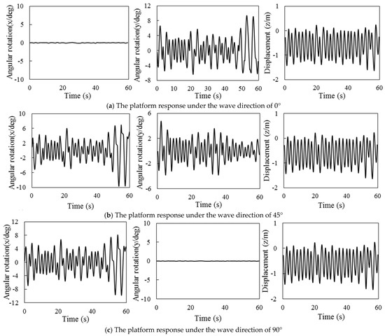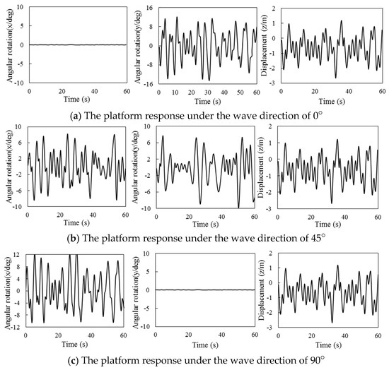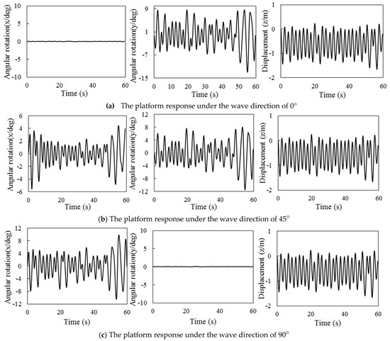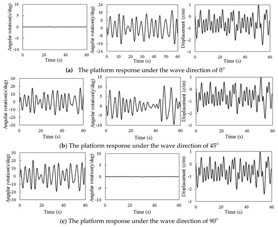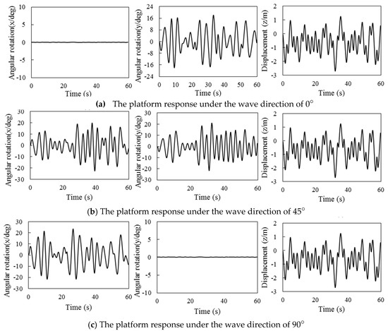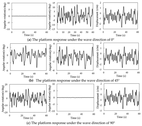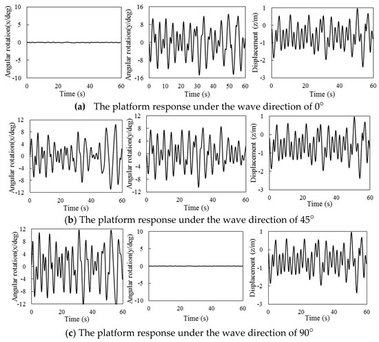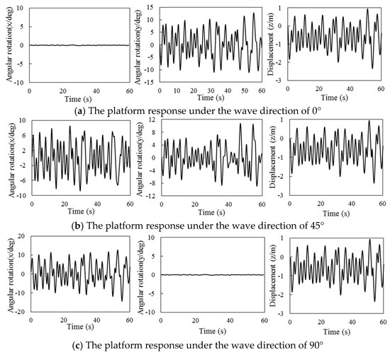 Figure 5 shows the response of the floating platform with wave directions of 0°, 45°, and 90°, respectively. Figure 5a is the platform response at the wave direction of 0° (the one on the left shows the angular variation around the x axis, the middle one shows the angular variation around the y axis, and the last one shows the heave movement). Figure 5b,c shows the platform responses with the 45° and 90° wave directions, respectively. The following figures are arranged in the same way as Figure 4. Figure 5 and Figure 6 show the responses of the floating platform with wave directions of 0°, 45°, and 90°, respectively, under wind-sea scale 4 and 5, respectively.