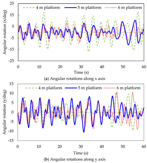 The effect of different airbag lengths on the swaying angle is investigated via comparing platform rotations under the same working conditions. Taking the wave direction of 45° as an example, angular rotations along x and y axis are compared as shown in Figure 14. It shows that increasing the length of the airbag can effectively reduce the swaying angle of the platform, but there is no significant change between a 5 m platform and a 6 m platform.