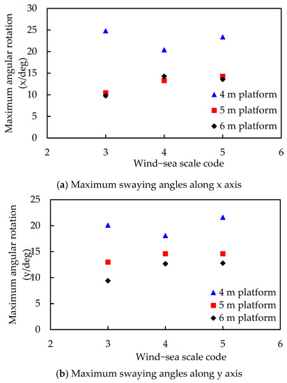 Maximum angular rotations of different size platforms under different wind−sea scales.