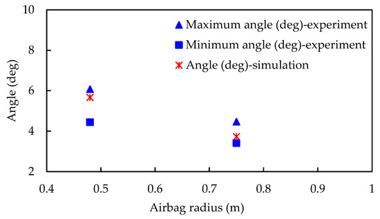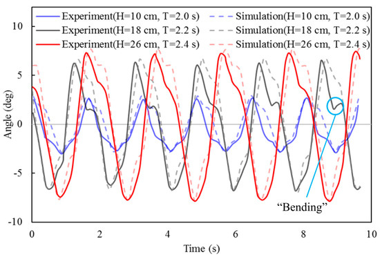 As shown in Figure 17, the experimental results agree well with the numerical simulation, and the angle of the platform is obviously related to the wave height and period. During all the periods, there is a typical “bending” phenomenon (denoted in Figure 16) in the experimental and simulation results, where shows some difference between the two results. This is because the airbag has a certain elasticity, which causes the delay of the angle response.