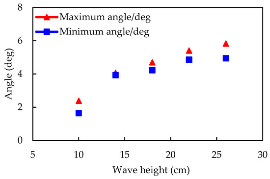 The angle response of the floating platform under different wave heights and periods was tested, and the results are shown in Figure 18 and Figure 19. Figure 18 shows that wave height has a significant influence on the platform angle. The maximum angle increases from around 2.4° to 5.8° when the wave height is changed from 10 cm to 26 cm. In Figure 19, the period change also shows its influence on the angle response. The maximum angle under 18 cm wave height increases by 5° when the wave period increases from 2 s to 2.4 s, and it is 2.3° for the situation of a 26 cm wave height.