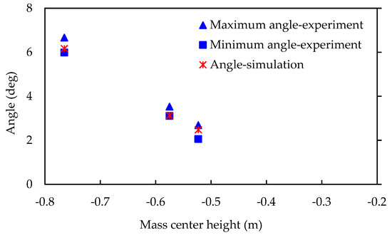 The effect of two parameters, mass center and airbag radius, were investigated in the scaled model experiment to verify the design, the results of which are shown in Figure 20 and Figure 21. Figure 20 indicates that the maximum angle decreases with the increase in the position of the center of mass. The maximum angle decreases as the radius of the floating airbag decreases, as shown in Figure 21. Therefore, appropriate system mass center and platform radius can reduce the maximum sway angle of the system.