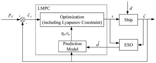 In the ADLMPC scheme, ESO can estimate environmental disturbances d. The prediction model can provide predictive state over the prediction horizon and be updated online through estimated environmental disturbances , improving the prediction capability and control performance. The optimization module can determine the control input τ based on tracking error ζe and predictive state ζP. Moreover, the Lyapunov contraction constraint is added to the optimization module to guarantee closed-loop stability.