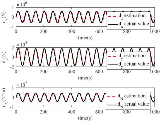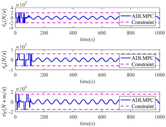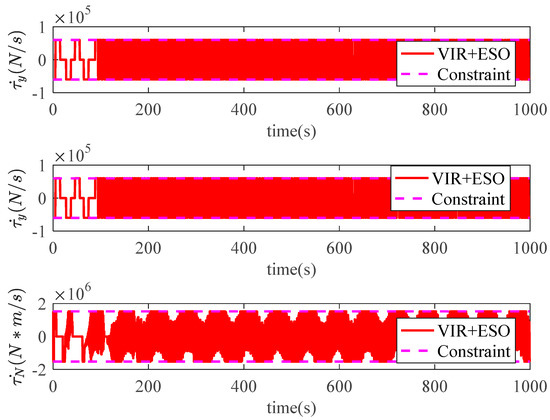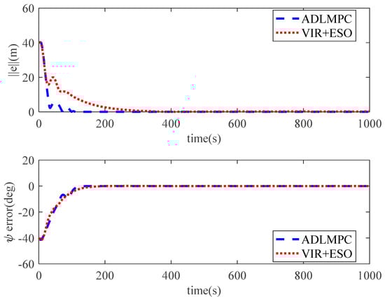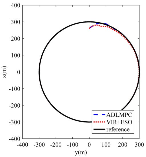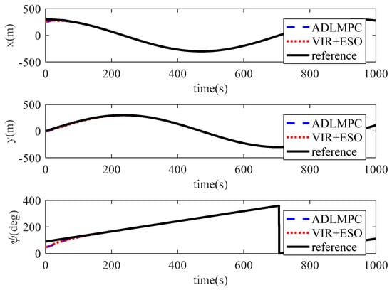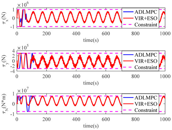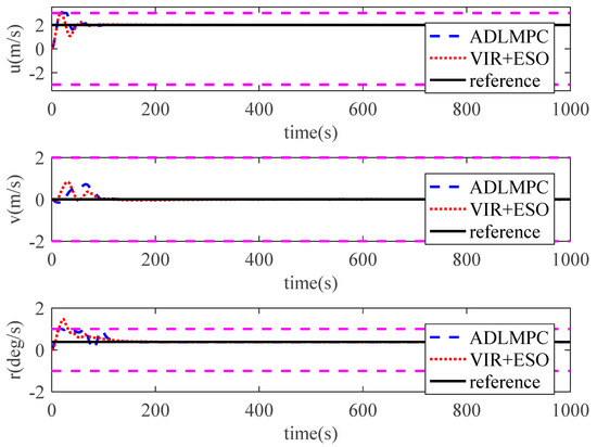 controller with ESO (VIR+ESO) are illustrated in Figure 3 and Figure 4. As we can see, both controllers show high qualities of control performance, which can accurately control the model ship perturbed by environmental disturbances to track reference trajectory. However, Figure 3 illustrates that the model ship can track the reference trajectory more rapidly with the proposed ADLMPC controller. Meanwhile, Figure 4 demonstrates more detailed information. The position tracking error and the heading tracking error of both controllers are presented in Figure 5, which indicates that tracking errors resulting from both controllers converge to a small neighborhood of the origin. The efficacy and closed-loop stability of both controllers are verified. In detail, by the effect of ADLMPC and the virtual controller, the position tracking error achieves convergence in about 100 s and 300 s, and the corresponding steady-state error is near 0 and about 0.5 m. Moreover, the mean square errors (MSE) for both controllers are listed in Table 1. It can be seen from Table 1 that compared with the VIR+ESO, the MSEs of position states (x and y) with the proposed ADLMPC controller appear to have different degrees of decline. The improvements in the MSEs of position states with the ADLMPC controller are 20.2% and 73.5%, respectively. This information shows that no matter the accuracy of tracking or the convergence time, the ADLMPC controller’s tracking performance is better than the virtual controller, which mainly results from the optimization module in ADLMPC. This module can provide optimal or sub-optimal control law by solving the optimization problem online, which means that thrusters can be utilized more efficiently. Figure 6 and Figure 7 describe the control inputs of both controllers, from which we can observe that control inputs do not violate the input constraints. Additionally, the torque generated by the ADLMPC controller in the first 100 s is more significant than that generated by the virtual controller. This means that the ADLMPC controller fully utilizes the thrusters to track the reference trajectory rapidly. The rates of change in control inputs produced by both controllers also satisfy the control input constraint in Figure 8. However, the rates of change in control inputs generated by the virtual controller are much more severe, aggravating the wear of thrusters and reducing their lifetime. It can also be understood that the virtual controller has to frequently change the thrust to achieve a similar tracking performance as the ADLMPC controller. Figure 9 illustrates the variation of speed states (u, v, and r) over time. Although both controllers can control the model ship to track reference speed, the state of r controlled by the virtual controller is out of the upper limit in 14–32 s. The main reason is that the speed state constraints are not considered when designing the virtual controller. This highlights the advantage of the ADLMPC controller in tackling system constraints explicitly. The estimation performance of the designed ESO is plotted in Figure 10. It reveals that the designed ESO can accurately estimate the actual disturbances. Regarding the computing burden of the ADLMPC controller, the average calculation period of the optimization control problem Equation (9) is around 70 ms, which means that the ADLMPC has positive real-time performance.
