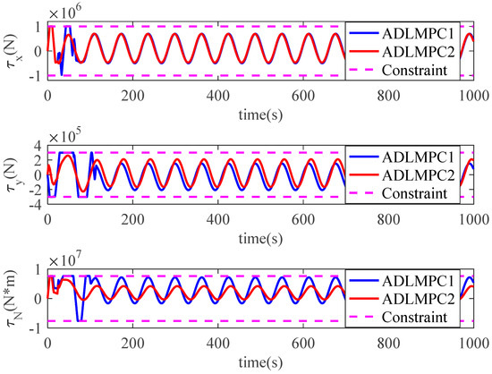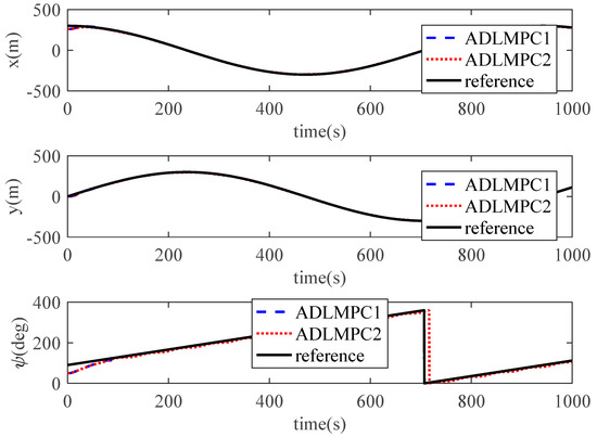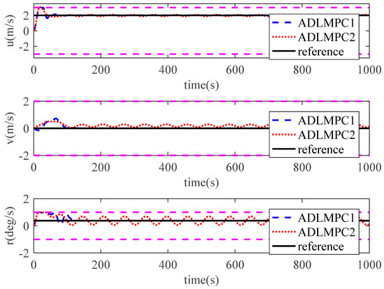 . The remaining parameters are maintained, including the prediction horizon, control gain matrices of the virtual controller, and observer gain matrices. The initial states of the model ship and environmental disturbances are also the same as those in case 1. Simulation results are shown in Figure 11, Figure 12, Figure 13, Figure 14, Figure 15 and Figure 16, and ‘ADLMPC1’ and ‘ADLMPC2’ in these figures mean the ADLMPC controller with weighting matrices Q1, R1, and with Q2, R1, respectively.