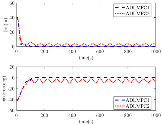 Tracking errors of position and heading controlled by ADLMPC1 and ADLMPC2.