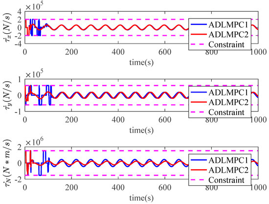 The ship trajectories controlled by the ADLMPC1 controller and the ADLMPC2 controller are demonstrated in Figure 11, Figure 12, Figure 13 and Figure 14. The ADLMPC1 controller shows a high accuracy in tracking performance under the effects of environmental disturbances, whereas the quality of tracking by the ADLMPC2 controller deteriorates. Specifically, Figure 13 and Figure 14 illustrate that instead of maintaining the ship position and speed on the reference values, all these states fluctuate near the reference values. On the other hand, Figure 15 and Figure 16 show whether the magnitude of control inputs or rate of change in control inputs generated by the ADLMPC2 controller are smaller than those generated by the ADLMPC1 controller, especially in the first 100 s. The main reason for the phenomena above is that the values of elements in Q1 are larger than those in Q2, while the values of elements in R1 are smaller than those in R2. A decrease in Q and an increase in R mean that we pay more attention to the energy cost of thrusters rather than the accuracy in tracking. Therefore, the ADLMPC controller reduces the energy cost by degrading the tracking performance.