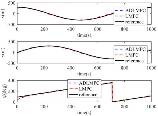 To investigate the advantage of anti-disturbance in the ADLMPC controller compared with the LMPC controller proposed in [25,26], we conduct the simulation (simulation case 3) under environmental disturbances. For effective comparison, the parameters for the LMPC controller and ADLMPC controller are set to the same values as those of the ADLMPC controller in case 1. The initial states of the model ship and environmental disturbances are also the same as those in case 1. Simulation results are shown in Figure 17, Figure 18 and Figure 19. These figures demonstrate that the accuracy of trajectory tracking in the effects of environmental disturbances in the ADLMPC controller is much higher than that of the LMPC controller. It can be seen from Table 2 that the MSEs of x, y, and ψ with the LMPC controller are more than 8 times, 20 times, and 10 times larger than those with the ADLMPC controller. These simulation results can illustrate the effectiveness of anti-disturbance with the ADLMPC controller.