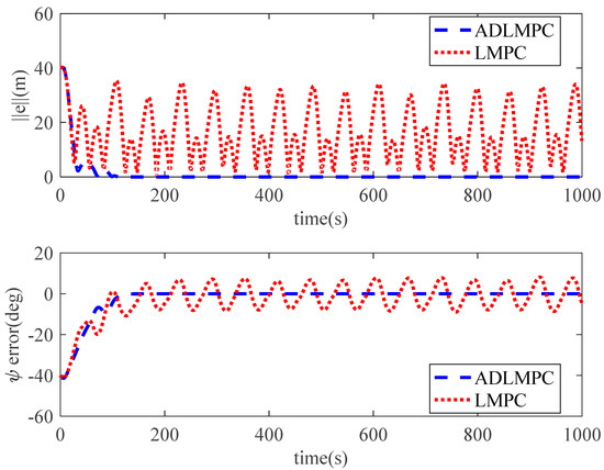 Tracking errors of position and heading controlled by ADLMPC and LMPC.