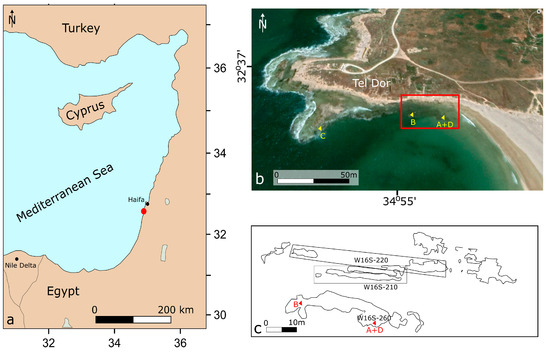 Tel Dor is the largest archaeological site along the Carmel coast of northern Israel (Figure 1). It was inhabited almost continuously from the Middle Bronze Age (ca. 1950–1550 Before the Common Era—BCE) to the Late Roman Period (ca. 250 CE) [24,26]. Recent coastal and underwater studies at the site found evidence for the use of its South Bay as an anchorage in the Middle and Late Bronze Age (ca. 1950–1200 BCE) and a built harbor infrastructure in the Iron Age Ib (1050–900 BCE) as well as the Iron IIc (700–586 BCE). This highlights its importance for the study of the development of ancient harbors, a major manifestation of anthropogenic pressure on the environment [27,28,29].