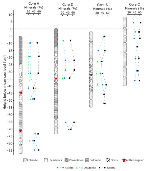 In general, the petrographic analysis allowed for the distinction among three different rock compositions. In all cores, segments with homogeneous quartz sand grains were identified as eolianite, and segments with a conglomerate of shells, biogenic grains, and quartz sand grains were classified as beachrock. These often contained indications of anthropogenic debris, such as pottery fragments. Biogenic layers controlled by Vermetidae were labeled as such. Results are presented in Figure 2.