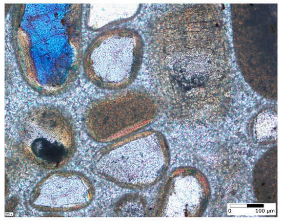 Petrographic slide showing the rounded ooids found in Core A (Figure 2).