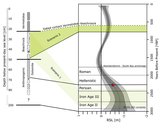 Conceptual model showing the correlation of sea level oscillation (modified after [46]) and the main phases of Core A, which are correlated to years before present (years BCE + 2000) on the basis of deductions explained in the text. Green represents the two possible scenarios for beachrock formation. RSL—relative sea level (in meters). The ages provided indicate the possible periods when the rocks were emplaced up to the dolomite layer. Above the dolomite, ages represent possible dates of formation resulting from anthropogenic influence as explained in the text. Red star marks when sea level was 50 cm below present-day level during the transition between the Persian and Hellenistic periods.