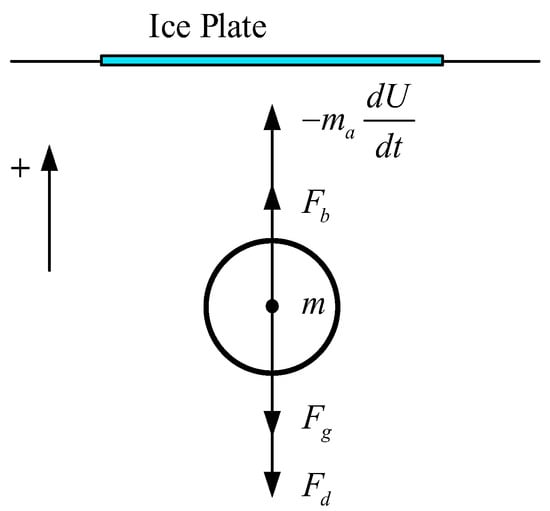 where is the mass of the sphere, where is the volume of the sphere; is the added mass of the sphere and is the added-mass coefficient; is the buoyant force; is the gravity force; is the drag force, where is the cross-sectional area and is the drag coefficient. It is remarkable that is concerned with the distance between boundary to the sphere [37,38,39].