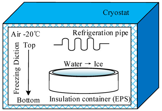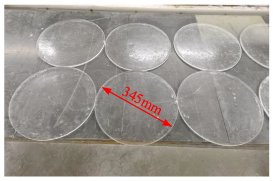 From the perspective of ice mechanics, ice can be regarded as one of the most complex materials in nature [45,46,47]. Ice in nature contains many defects, including preexisting cracks, inclusions, pores, grain boundaries, etc. [48,49] which further aggravates the uncertainty of the experiment. Therefore, some researchers [50,51,52] proposed using freshwater as the material to prepare experimental ice in the laboratory. Figure 3 shows a schematic diagram of the freshwater ice plate preparation method. The ice plates in this study were made by freshwater in a cryostat at −20 °C. The freshwater was boiled in order to maximize the removal of dissolved air in the water and to avoid the presence of bubbles. The boiled fresh water was placed in a cylindrical container without a top cover. The container was made of expanded polystyrene (EPS), whose good adiabatic properties ensure that the heat transfer direction was from top to bottom, in the same way as the growth direction of the ice crystal in reality. When the requirements of the thickness of the ice plates were met, the ice plates were removed from the container and moved into a cryostat at −5 °C for 10 h, which was to prevent the ice plate from breaking due to the excessive temperature difference between the ice plate and water [15,53]. Figure 4 shows a picture of the ice plate samples. The diameter of ice plates was 345 mm, and the thicknesses were 6 mm, 8 mm, and 10 mm, respectively. The mechanical properties of the ice plate were obtained by testing at −5 °C. The average value of Young’s modulus of ice was 6.2 GPa, and the average compressive and flexural strengths of ice were 9.4 MPa and 2.4 MPa, respectively. The rest of the properties can be found in Ni et al. [53].