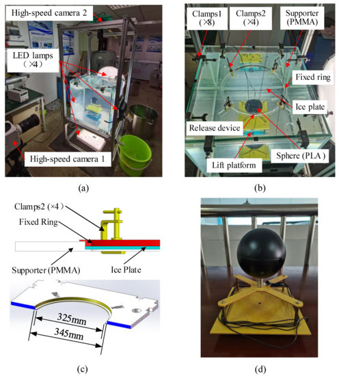 Experimental setup: (a) supporting system and camera system; (b) ice-fixing system and sphere location and releasing system; (c) cross-section diagram of ice-fixing supporter and the fixation way of the ice plate; and (d) releasing device and the sphere.