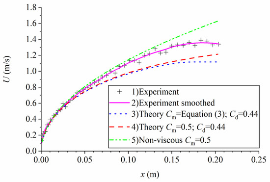 Figure 6 shows curves of the velocity of the sphere along with the displacement before colliding with the ice plate. It contains: (1) initial experimental data; (2) curve obtained after filtering experimental data; (3) theoretical results with = Equation (3) and ; (4) theoretical results with and ; (5) theoretical results of Equation (8) with and .