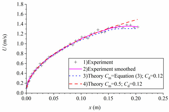 Second, the choice of was particularly worth discussing. For unsteady motion, the drag coefficient is different from the counterpart at steady state. Many researchers [54,55,56,57] have carried out experimental and theoretical studies on it. For the convenience, we temporarily assumed . As we know, of a sphere is closely related to Re number. When 1.0 × 103 < Re < 2.0 × 105, is around 0.44 [58,59,60,61]. Re number of the sphere in this case was mostly distributed in this interval, so the resistance coefficient was taken as 0.44 in curves (3) and (4). By comparison, was adopted in curve (5). However, it can be seen from the comparison between curve (4) and curve (5) that the resistance coefficient of the sphere in actual motion was less than 0.44, which coincided with the researches of [62,63] on the point that was smaller than . For this reason, we decreased the resistance coefficient . By trying a series of resistance coefficients, we found that when = 0.12 (as shown in Figure 7) could predict the motion of the sphere well in our cases, especially considering the influence of the wall surface on .