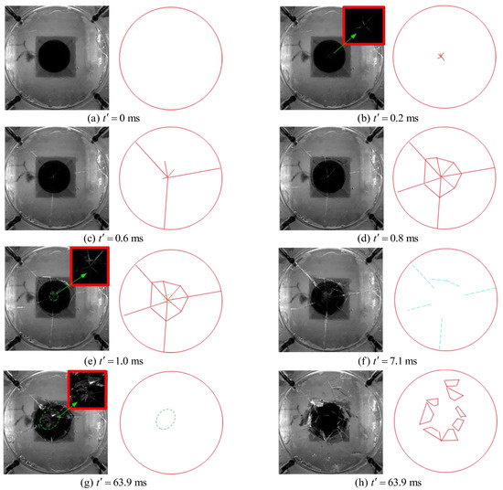Under the acceleration process in water, as shown in Figure 6, the buoyant sphere obtained a certain velocity and started to collide with the ice plate. Figure 8 shows the typical characteristics and corresponding time during the process of the sphere impacting the ice plate until it is broken. The moment when the sphere just contacted the bottom surface of the ice plate was defined as the initial time ( ms), as shown in Figure 8a. At the time of ms, the first radial cracks (RCs) appeared on the ice plate clearly under the collision of the sphere, shown in Figure 8b. The patterns of cracks were quite similar to those during icebreaking under distributed loads by Ashton [49]. Under the continuous loads from the buoyant sphere, radial cracks extended to the edge of the ice plate at the time of ms in Figure 8c, as marked by the red line. Figure 8d shows the formation of circumferential cracks (CCs), which were generated on the basis of RCs [26]. After generating CCs, cone cracks could be observed in the vicinity of the contacting point (stuck out by the green dotted line and partial enlarged in Figure 8e). After that, the ice plate began to break, and air entered under the ice plate through the cracks, which appeared as bubbles along the cracks in Figure 8f (stuck out by the blue dotted line). Then, cone cracks penetrated the ice plate and the debris splashed by the impact of the sphere (shown by the green circle in Figure 8g). Finally, under the action of the sphere, the wedge-shaped ice pieces in the center of the ice plate failed, and the sphere broke through the ice plate and pushed the polygonal ice fragments aside, as shown in Figure 8h. The damage process of the ice plate after impact can be summarized as follows: first, the ice plate produced RCs (RCs pattern); second, CCs were generated on the basis of RCs (RCs⊕CCs pattern); third, the ice debris splashed (debris-splashing pattern); finally, the ice plate broke up (ice-plate breakup pattern).
