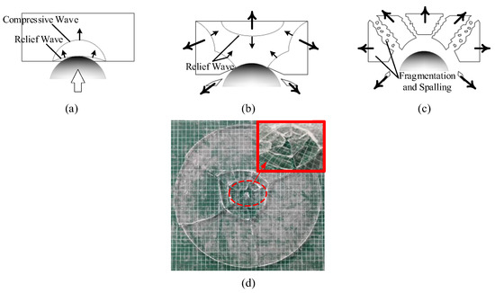 Schematic sequence of events in the impact, adapted from [29]: (a) immediately after impact, stress waves are generated; (b) relief waves propagate from the upper surface and fine debris splits away off; (c) interacting relief waves cause fragmentation and spalling; and (d) the broken ice plate is reassembled, and the center of the ice plates forms some sloped fractures due to the impact of the sphere.