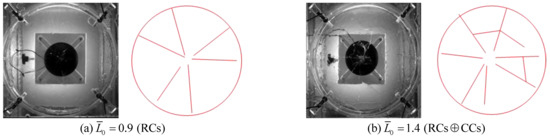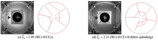 Figure 10 provides the ice damage at four initial submergence depths, in which the time was all chosen at s. In Figure 10a, it can be observed that there were slight and inconspicuous RCs extending from the center of the ice plate to the edge, i.e., RCs pattern. With the increase of the initial submergence depth of the sphere, in Figure 10b, the ice was damaged severely with a greater number of RCs and several slight CCs at a distance from the center, i.e., RCs⊕CCs pattern. In Figure 10a,b), ice plates did not break up, or the cracks did not penetrate the ice plate, which was also named ‘part-through’ cracks [65]. In terms of the damage pattern of the ice plate, the phenomenon shown in Figure 10c was not changed significantly from that shown in Figure 10b. However, one can observe that air bubbles were captured under the ice plate, as denoted in the blue circles. This is because the cracks had penetrated the ice plate and air entered through the cracks and edges. When the initial submergence depth increased to 2.31, as shown in Figure 10d, in addition to RCs and CCs on the ice plate, ice debris can be clearly found splashing from the center of the ice plate, i.e., a debris-splashing pattern.