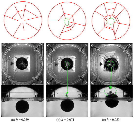 Typical damage patterns of ice plates with different dimensionless thickness with the initial condition of = 0.6 and = 2.31 when = 0.1 s. (upper photos are captured a from bird’s eye view by Camera 2 and lower ones are captured from a horizontal perspective by Camera 1).
