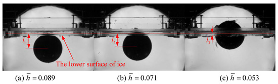 Figure 12 displays final equilibrium positions of the sphere after resting. By comparison, it can be found that although the sphere did not break through the ice plate in Figure 12a,b, the final submergence depth was different. was larger than a bit, while and were both larger than distinctly. This can be expected as the thinner the ice plate was, the damage the ice plate became more severe. The damage to the ice plate, including debris and hole, provided space for the sphere to rise.