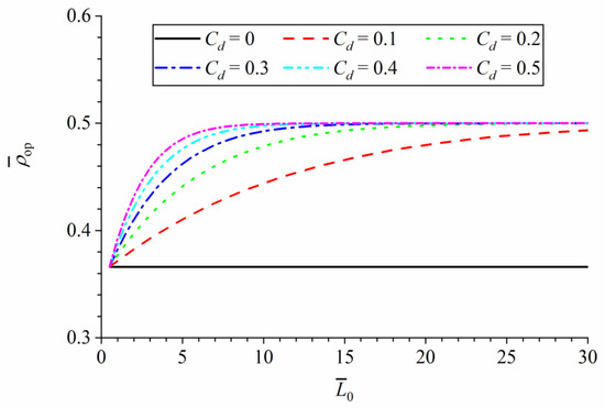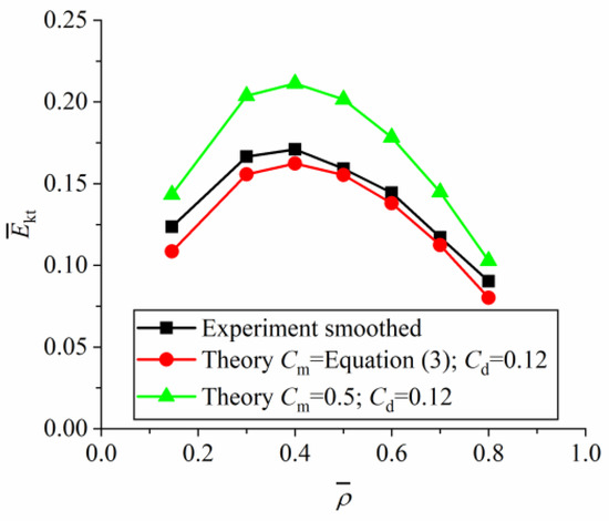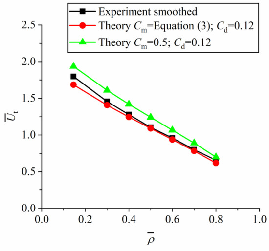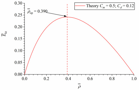We further plot the curve of versus to find with the case of = 0.089 and = 2.31 in Figure 19. As mentioned above, considering that the added mass coefficient has little influence on the optimal density, we chose = 0.5 as convenience and still chose = 0.12 as before. It is clear that the theoretical optimal relative density = 0.390 was very close to the result in Figure 18 in the experiment. Therefore, when the initial depth and ice thickness were constant, one can predict the optimal relative density in theory.