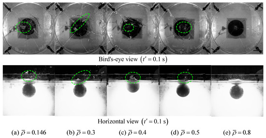 Figure 16 shows typical pictures of the damage on the ice plate caused by spheres of different densities, at s from a bird’s-eye view and horizontal view, respectively. From Figure 16a–c, it can be seen that with the increase of the relative density of the sphere, the damage state of the ice plate changes from “debris splashing” to “ice plate breakup” patterns; while from Figure 16c–e, the damage state of the ice plate changes from “ice plate breakup” to “debris splashing” and then to “RCs” patterns.