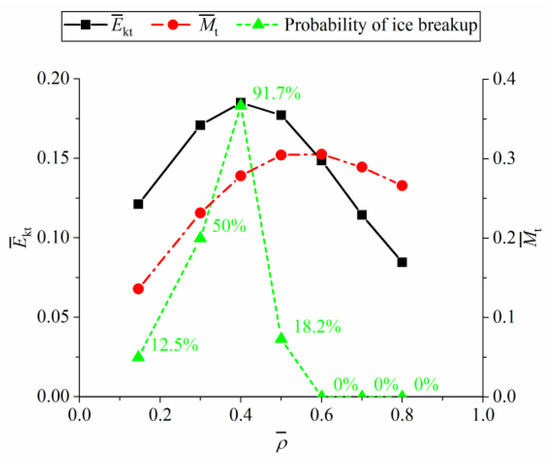 As discussed in Section 4.3 and Section 4.4, the “ice plate breakup” pattern is the most severe of all the patterns. We took the probability of this pattern as a criterion and tried to link the damage degree of the ice plate with and of the sphere in Figure 14 and Figure 15. As shown in the Figure 18, the dimensionless kinetic energy of the sphere achieves the largest at = 0.4, while the dimensionless momentum of the sphere achieves the largest at = 0.6. Compared with the probability of the ice-breakup pattern, when the kinetic energy of the sphere is the largest, the probability of the ice plate breakup peaks (91.7%). From this point, it can be concluded that the kinetic energy of the sphere, rather than momentum, at the moment of collision dominates the damage degree of the ice plate. As a result, we adopt kinetic energy of the sphere at the moment of collision as a criterion for the icebreaking ability of a floating light sphere driven by net buoyant force hereinafter. This conclusion can also be well explained from the perspective of energy. When the sphere collided with the ice plate, the sphere converted its kinetic energy into kinetic and potential energies of the ice plate including cracks (or fracture energy), debris and fragments, kinetic and potential energies of fluid, the potential energy of the sphere as well as thermal energy [29]. The more kinetic energy the sphere gained before impact, the worse the ice plate was damaged (presenting in the generation of cracks, area of the hole, the motion of the debris and fragments, etc.).