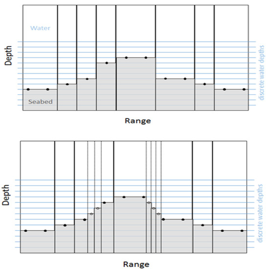 Thus, for each environment characterized by a certain sound-velocity profile and geoacoustic characteristics, the vertical problem is solved (the eigenvalues and eigenfunctions are calculated) for a number of discrete depths, and the coupling matrices are evaluated only between subsequent discrete depths. The fact that the coupling matrices are not calculated for all possible combinations of discrete depths saves a lot of storage space and also enables efficient recovery for acoustic field calculation. Furthermore, in the case of very steep bathymetry, intermediate grid points are added such that the interpolated depths comply with the discretization step (see Figure 2).
