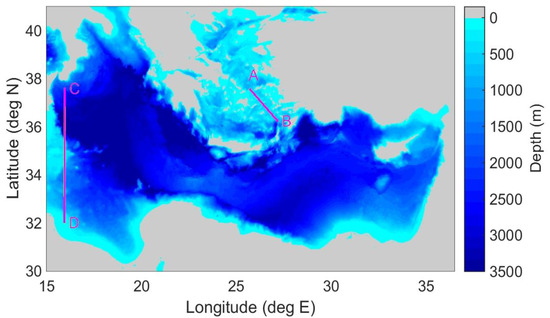 Bathymetry in the Eastern Mediterranean Sea. Transects A,B and C,D are used for comparisons of propagation calculations.