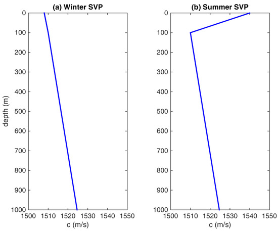(a) Winter sound velocity profile; (b) Summer sound velocity profile.