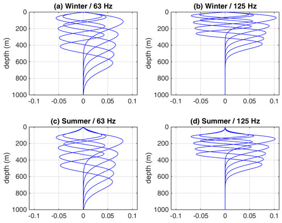 Figure 5 shows the mode shapes of the first five modes corresponding to the winter and summer SVPs of Figure 4, respectively, assuming a water depth of 1000 m, at the frequencies of 63 and 125 Hz, the central frequencies of interest in the MSFD for continuous low-frequency noise [2]. The support of the modes, i.e., the depth interval over which the modes attain non-zero values, is concentrated about the depth of the minimum sound speed. In this connection, the modes are displaced to larger depths in summer, compared to winter, whereas they vanish at the sea surface (pressure release, as described in Section 2.1). A consequence is that a shallow noise source, such as a surface ship, stimulates these modes more efficiently in winter than in summer. This has an impact on the anticipated noise levels in the water column. The effect becomes more pronounced with increasing frequency (125 Hz). In this connection, the winter modes are excited more strongly at 125 Hz than at 63 Hz by a shallow source. On the other hand, the summer modes undergo weaker excitation at 125 Hz than at 63 Hz due to their values being closer to zero at shallow depths. It is also noted that the modes at the higher frequency are more confined in depth, and, because of the normalization, they attain higher values.