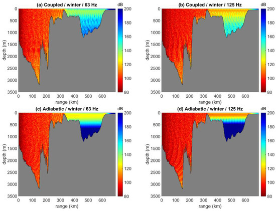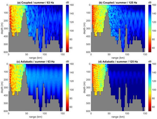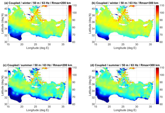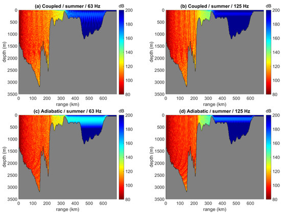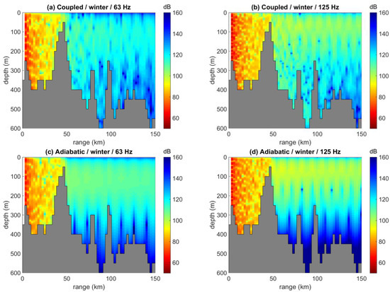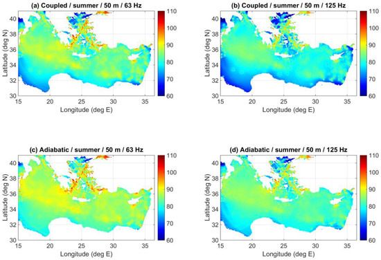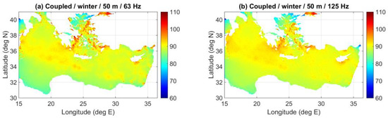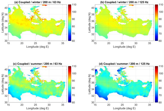 Figure 13 shows coupled-mode predictions of the received noise levels at a depth of 200 m, due to the same ship distribution, at 63 and 125 Hz and for the winter and summer SVP, respectively. Comparison of the corresponding results at a depth of 50 m, Figure 11a,b and Figure 12a,b, respectively, reveals only minor differentiations of the noise field with respect to depth.