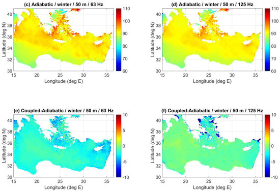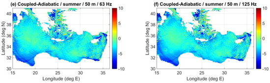 Noise distribution (dB re 1 μPa2/Hz) in the Eastern Mediterranean Sea at a depth of 50 m for the winter SVP for the source distribution of Figure 10, assuming all sources at 5 m depth, with spectral source levels of 165 dB re 1 μPa2/Hz @ 1 m at 63 Hz and 155 dB re 1 μPa2/Hz @ 1 m at 125 Hz. (a) Coupled-mode results at 63 Hz; (b) Coupled-mode results at 125 Hz; (c) Adiabatic results at 63 Hz; (d) Adiabatic results at 125 Hz; (e) Difference between coupled-mode and adiabatic results at 63 Hz; (f) Difference between coupled-mode and adiabatic results at 125 Hz.