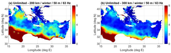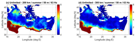 To make the comparison clearer, the differences between the predictions with unlimited propagation range and those with truncated range are presented in Figure 15. As expected, the shorter the limiting range, the larger the differences. Nevertheless, even with a truncation at 300 km, there are significant differences reaching and exceeding 8 dB (up to 20 dB, colored dark red) away from the major shipping lanes, e.g., in the southwestern part of the Ionian basin; note that the color scale in Figure 15 focuses on differences up to 8 dB in order to better illustrate the differences in all marine areas of the entire modelled domain, and larger differences are cropped. Further, the differences are, in general, somewhat larger in winter than in summer. This is associated with the higher noise levels in winter compared to summer, for the same noise source distribution, cf. Figure 11a and Figure 12a, and is an indicator that shipping noise in winter survives longer distances than in summer due to the existence of the surface duct.