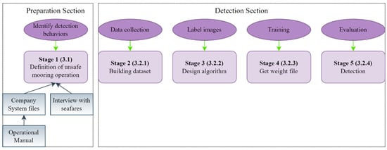 This research began by defining the unsafe mooring operation and summarizing seven typical unsafe mooring operations for automatic detection and recognition (Section 3.1). A dataset covering these unsafe behavior images was established by onsite shooting using the installed Huawei D2150-10-siu infrared pinhole camera aboard the ship (Section 3.2.1). Based on the processed dataset, a Mobile-v3-YOLO-v4 network was developed (Section 3.2.2) and trained to establish its weights (Section 3.2.3) and realize the unsafe behavior detection on the video stream (Section 3.2.4). The research steps are illustrated in Figure 1 and described in detail in the following subsections.