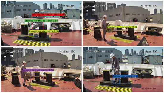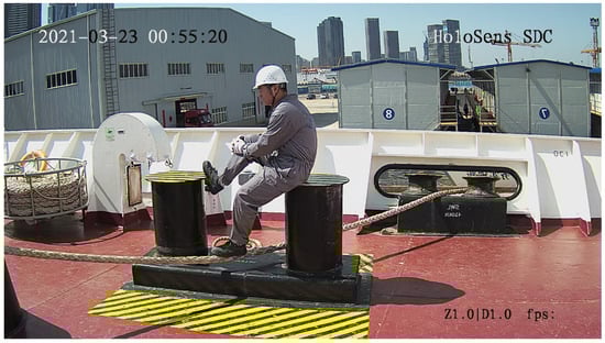 The shooting area covers the entire deck, including the mooring line windlass, each fairway, and the bollard. The captured video size was 1920 × 1080 pixels, and the frame rate was 60 frames per second (FPS). Images with unsafe behaviors were extracted from video data every ten seconds. In total, 3000 images with unsafe behaviors were selected to comprise the dataset.