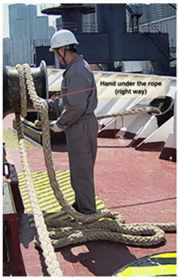 After collecting and analyzing that information, seven representative unsafe mooring operations on board were identified (Table 1). The summarized unsafe behaviors are also emphasized in Mooring Operations Manual developed by Pacific International Lines company (PIL). For example, walking across the mooring rope and standing in a loop or “bight” of any rope may lead to severe damage to the seafarers (Figure 2). In addition, many seafarers are prone to sit on the bollard or stamp on the taut mooring rope to rest when working on the deck. Although they do not carry out mooring operations while resting, it is considered a hazardous state that has led to severe injuries. Such behavior is prohibited in shipping companies’ SMS documentation. Still, unsafe behaviors, as shown in Figure 3, are uncommon in practice but were revealed by the interviews with crews on the M.V. YuKun. An experienced sailor also emphasizes that while holding a rope, it is essential to remember never to put a hand over the rope because its vibration may damage the hand, and it is hard to pull the hand out when the rope is broken (Figure 4) [31].