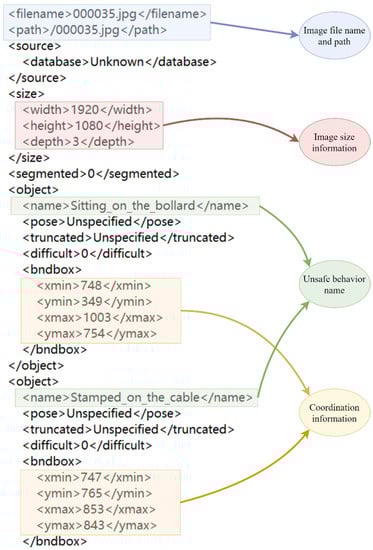The dataset was annotated using the open-source script labeling from GitHub (https://github.com/tzutalin/labelImg (accessed on 25 July 2022), and images with unsafe behaviors were manually labeled. After labeling, an XML file was generated containing the image name corresponding to the labeled file, the image size, the name of unsafe behavior, and the coordinate information of the labeled actions. An example of an XML file is presented in Figure 8.