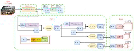 We utilized the YOLO-v4 convolutional neural network (CNN) for the detection network, but we replaced CSPDarknet53 in the original YOLO-v4 with Mobilenet-v3 as the backbone network for faster detection and less resource consumption. This subsection briefly introduces YOLO-v4 and Mobilenet-v3 and explains the improved YOLO-v4.
