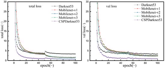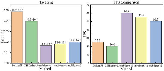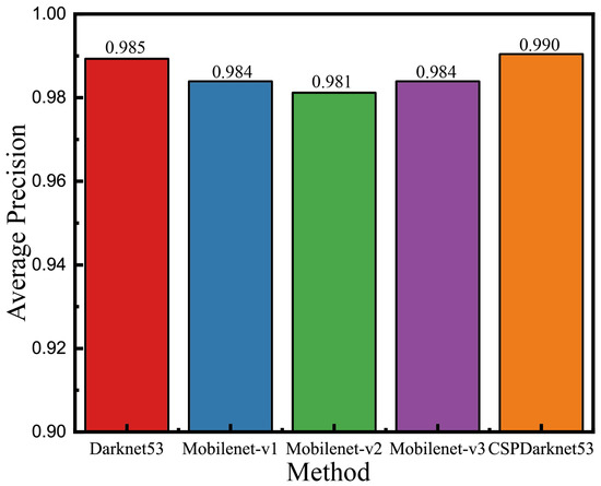 Figure 19 compares the overall accuracy rate of mAP obtained by the five backbones. It can be seen that, overall, the accuracy rates of YOLO-v3 using Darknet53 as the backbone and YOLO-v4 using CSPDarknet53 as the backbone are slightly higher than those of employing YOLO-v4 and Mobilenet as the backbone. However, the difference is slight, only 0.16%, because the Mobilenet backbone affords lightweight processing, slightly decreasing the accuracy rate.