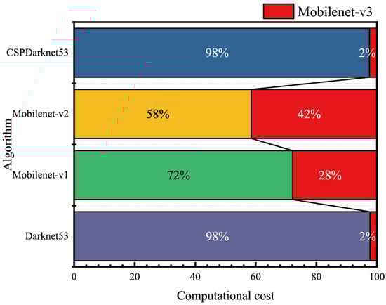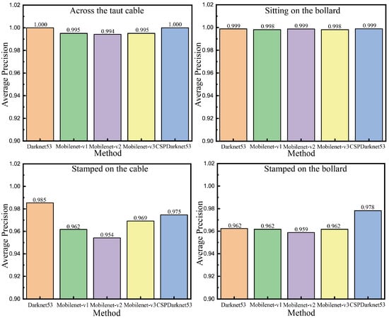Figure 20 compares the accuracy rates of several selected unsafe actions with the algorithm’s advantages and disadvantages determined by comparing the accuracy rates of individual actions. The corresponding results indicate that, for example, the accuracy of the Mobilenet series algorithm for actions such as “across the taut mooring line” and “sitting on the bollard” is not much different from that of the CSPDarknet53 and Darknet53 algorithms. At the same time, the effect is slightly worse for some actions of “stamping on the bollard” recognition. However, this comparison reveals that the accuracy of Mobilenet-v3 is improved to a certain extent compared with Mobilenet-v1 and v2.