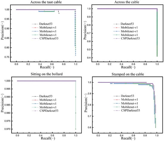 The PR curves of the YOLO-v4 algorithm using the Mobilenet-v3 as backbone are compared against the other competitor algorithms. Four different unsafe actions are selected for comparison, revealing that the closed area of the improved YOLO-v4′s PR curve is the same as that for the other algorithms. This means that using the Mobilenet-v3 as the backbone does not significantly reduce the recognition accuracy.