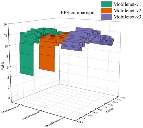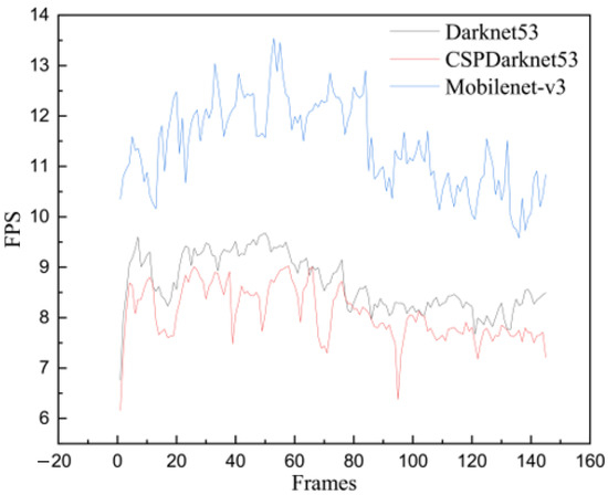 Figure 21 compares five algorithms’ single image processing speed, highlighting that YOLO-v4 based on Mobilenet is faster than the original YOLO-v3 and YOLO-v4. However, the processing speed of v3 is slower than that of v1 and v2, which is inconsistent with the previous algorithm analysis. Therefore, we still use the same video to detect the processing speed of the Mobilenet backbone in video processing. The FPS comparison chart of CSPDarknet53, Darknet53, and Mobilenet-v3 is depicted in Figure 22 and Figure 23, revealing that the recognition speed of Mobilenet-v3 is significantly higher than that of CSPDarknet53 and Darknet53. Additionally, the FPS value of Mobilenet-v3 is about 12, while CSPDarknet53 and Darknet53 afford 8.5 FPS. Figure 22 highlights that Mobilenet-v3 is better than v1 and v2 considering average processing speed and video frame rate stability.