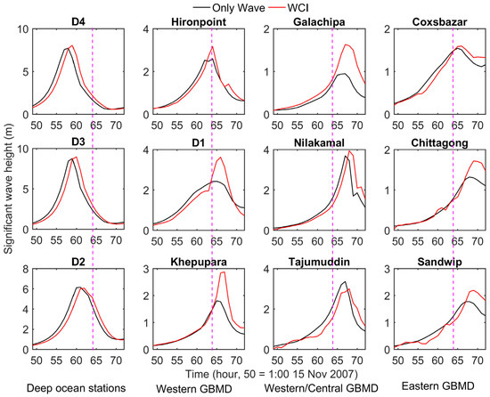 During cyclonic events, waves create significant impacts over the whole continental shelf and Bangladesh coast [33]. Cyclonic events generate higher wave height variations in the shallow compared with deep ocean regions due to the strong wind field. During the propagation of the wind-driven waves from the deep ocean to shallower areas, the magnitude of the wave height is modified through wave–current interactions, wave dissipation by bottom friction, whitecapping, and depth-induced breaking. The results of the ‘WCI’ (Run 1) and ‘Only Wave’ (Run 2) scenarios at stations across the GBMD are presented in Figure 2 to investigate the effects of the wave–current interactions on the waves. Including the effect of the wave–current interactions on waves produces a comparatively higher SWH than including only wind-driven waves at all the stations except Tajumuddin. The highest increase of SWH (1.19 m) is observed at D1, and the highest decrease of SWH is observed at Tajumuddin (−0.36 m) due to the wave–current interaction. Near to the landfall location (Khepupara), the SWH is increased by 59% (1.07 m) due to the wave–current interaction. The stations located on the right side of the track within the highest winds in the inner core at landfall (Khepupara, Galachipa and D1) have the highest percentages of change (more than 40%) in SWH from the wave–current interaction. Neglecting the mutual influence of waves and current on each other can cause an underestimation of the SWH by 1.2 m during a Sidr-like storm-surge event in the GBMD.